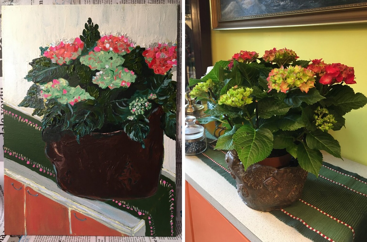 Aloitamme siis alusta. Huhtikuun 22. päivänä meillä Allanin kanssa täyttyi 2 vuotta tutustumisesta! Ja meidän rakkautemme yhä vain kasvaa ja kasvaa! Sovimme yhteen niin hyvin, että on suorastaan kiusallista kehuskella omalla onnella (mutta teen sen kuitenkin) 🥰. Meillä on edelleen se perinne, että kansainvälisenä Allanin ja Helena-Reetin päivänä, jota vietetään joka kuukauden 22. päivänä, minä teen lasagnea ja kermakakkua, ja Allan tuo minulle kukkia. Ensimmäiseksi vuosipäiväksi sain kauniin ruukun hortensioita, josta inspiraatiota saaneena tein sittemmin maalauksen ”Vuosi rakkautta” (A year of Love). Tämä 30×40 cm kokoinen kankaalle tehty akryylimaalaus oli myös vuonna 2021 Viron kansallismuseon näyttelyssä! How cool is that?! 🙂